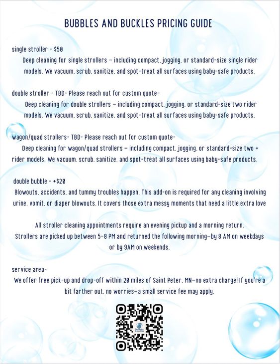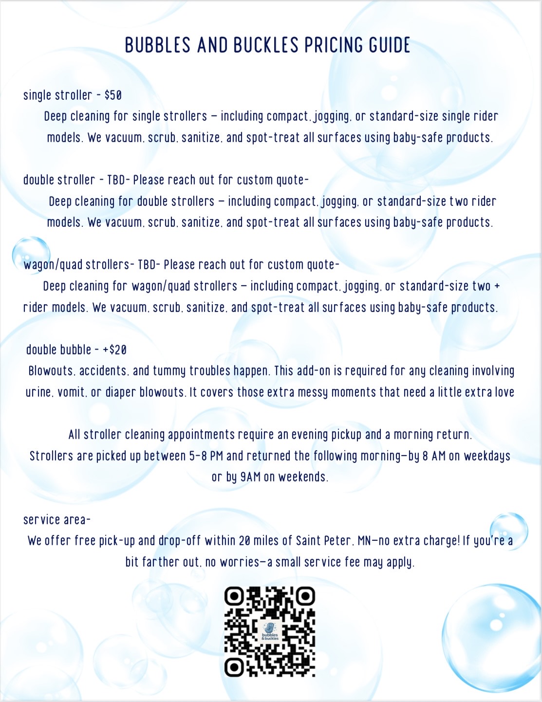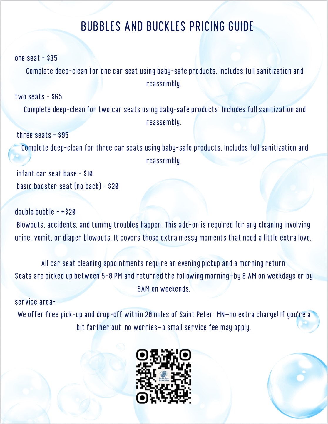Married nearly three years and parents to a busy little girl, we know firsthand how chaotic life with kids can be. That's why we started Bubbles & Buckles to give parents peace of mind, ad a little extra time back. Jonny's background in Environmental Health & Safety means we stick to eco-friendly products and safe cleaning standards. Amanda brings 17 years of parenting experience and a strong knowledge of car seat safety. When we're not cleaning car seats, you'll find us outdoors fishing, walking or swimming with our kids.